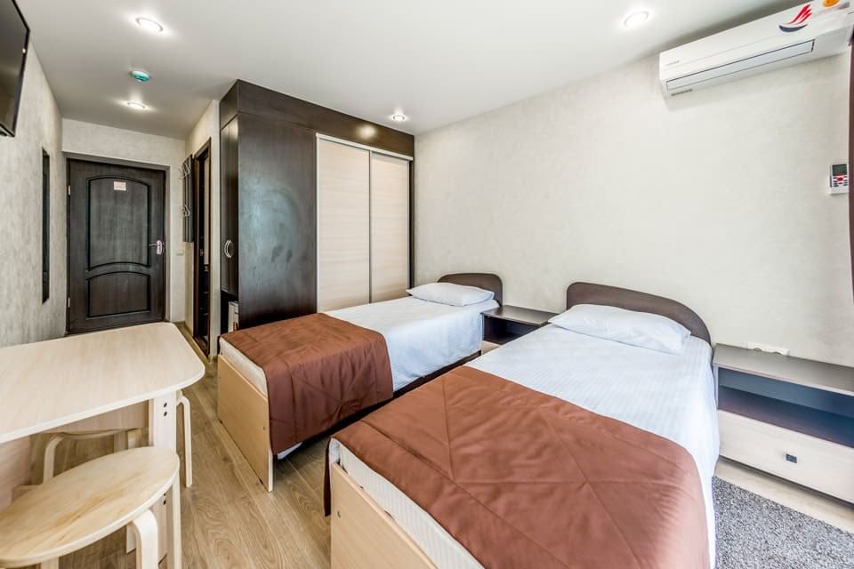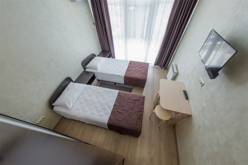 Это однокомнатный двухместный номер 15 кв.м с отдельными односпальными кроватями (при желании кровати сдвигаются) . Панорамные окна с видом на море и парковую зону. Санузел и душ. Телевизор и Wi-Fi. Кондиционер, гардероб, мини холодильник, прикроватные тумбочки. Дополнительно можно установить еврораскладушку.